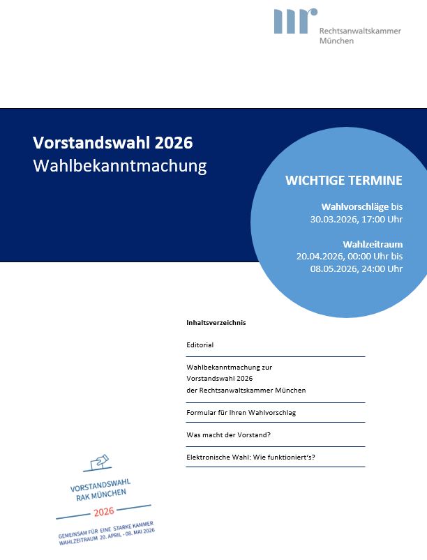 Hier finden Sie die Wahlbekanntmachung für die Vorstandswahl der Rechtsanwaltskammer München vom 20.04.2026 bis 08.05.2026, das Wahlvorschlagsformular sowie weitere Informationen zur Wahl.
